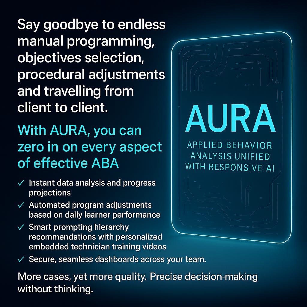 “Thanks, AURA!” Clara smiles. She’s been a consultant behaviour analyst for five years now, and things have changed a lot since she first qualified. With the advent of AI, more children have access to high-quality ABA services, and behaviour analysts have become more efficient. They can handle more cases without losing quality, since they no longer spend hours programming, reading curricular manuals and writing reports. AURA takes care of that.