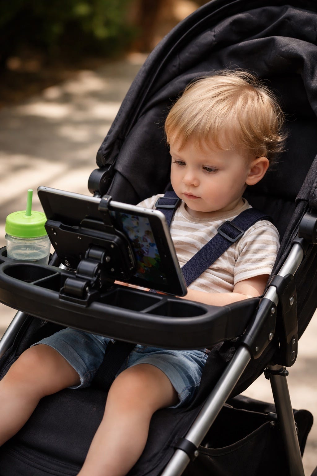 Sam does not look up. His gaze remains fixed on the screen mounted on a metal arm extending from his stroller. His mother unbuckles him. He clutches the rubber handle of the shock-proof military-grade case and lets out a piercing scream.