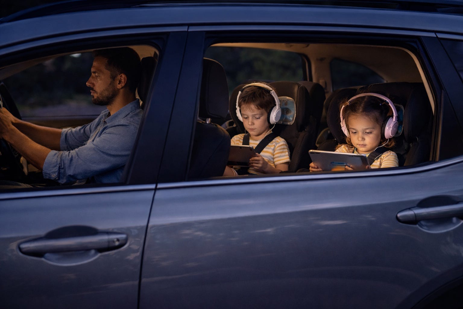 The taxi stops at the red light and Sage glances into the car beside her. A family. The father, hands on the wheel. The mother, tapping on her phone. Two children in the back, each facing a screen mounted on the back of each seat in front of them, headphones large enough to cancel the world outside, and inside.